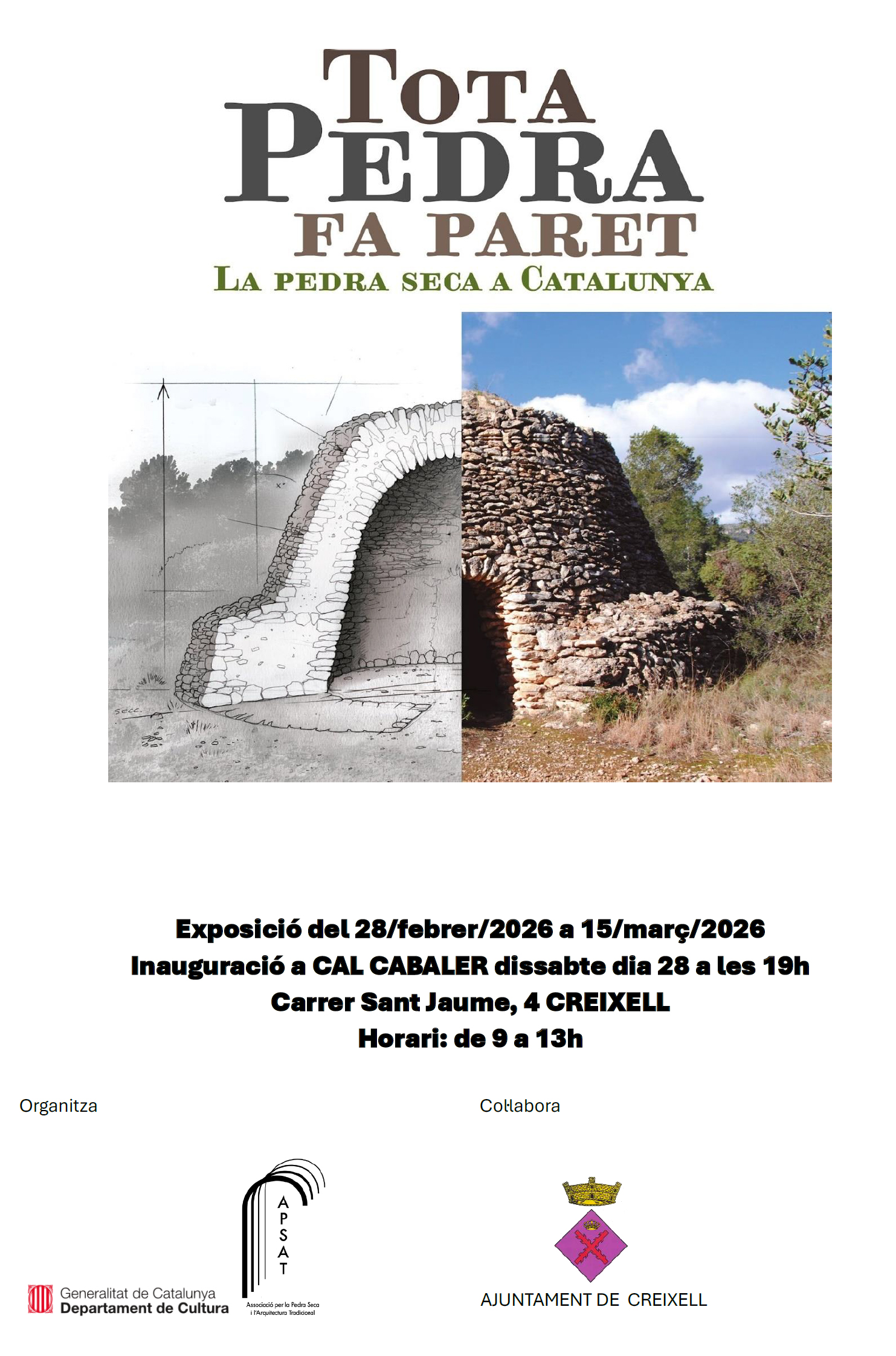 Del dissabte 28 de febrer al diumenge 15 de març de 2026 es farà a cal Cabaler l’exposició “Tota pedra fa paret. La pedra seca a Catalunya” que organitza la Direcció General de Cultura Popular i Associacionisme Cultural (DGCPAC) del Departament de Cultura de la Generalitat de Catalunya i l’Associació per la Pedra Seca i l’Arquitectura Tradicional (APSAT).